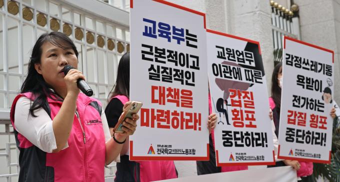 16일 오전 정부서울청사 후문에서 민주노총 서비스연맹 전국학교비정규직노동조합 주최로 '교육공무직 악성 민원 욕받이로 내모는 교육부 규탄 기자회견'이 열렸다.