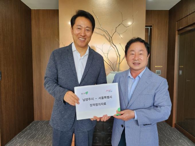▲주광덕 남양주시장(오른쪽)이 오세훈 서울시장에게 정책협의자료를 전달하고 있다. [남양주시 제공]