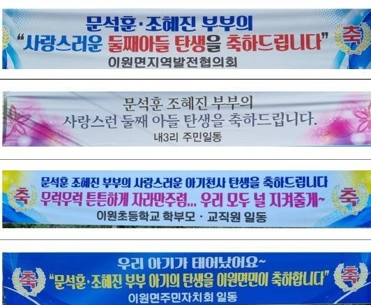 마을 주민들은 물론 이원면 지역발전협의회, 주민자치회, 이원초등학교 학부모·교직원 일동, 이원면사무소 등에서 아이의 출생을 축하하는 현수막을 관내 곳곳에 내걸었다.