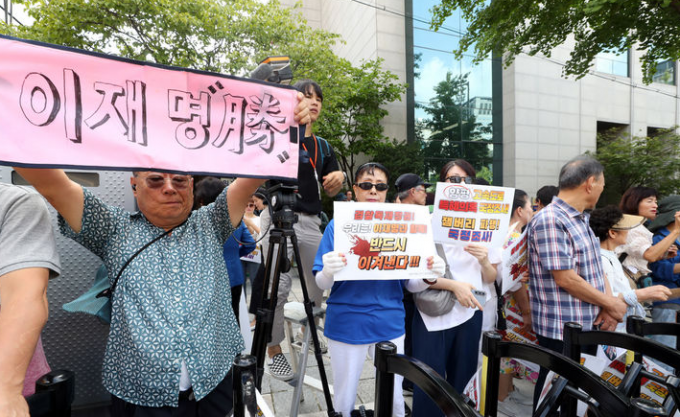 ▲ 17일 오전 서울 서초구 서울중앙지검 인근에서 더불어민주당 이재명 대표 지지자들이 검찰을 규탄하는 손피켓을 들고 있다. 이 대표는 이날 검찰에 출석했다. [뉴시스]
