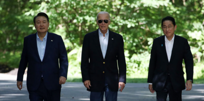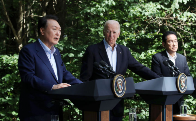 윤석열 대통령과 조 바이든 미국 대통령, 기시다 후미오 일본 총리는 이날 미국 메릴랜드주 캠프 데이비드에서 3국 정상회의에 이어 공동기자회견을 갖고 세계 정세의 전환점에서 한미일 관계 강화가 시대의 소명이라는 공감대를 드러냈다.