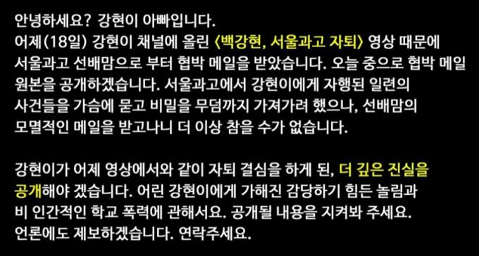 백군의 아버지는 20일 유튜브를 통해 전날 '백강현, 서울과고 자퇴' 영상을 공개한 뒤 서울과고 선배의 엄마로부터 협박 메일을 받았다고 밝혔다.