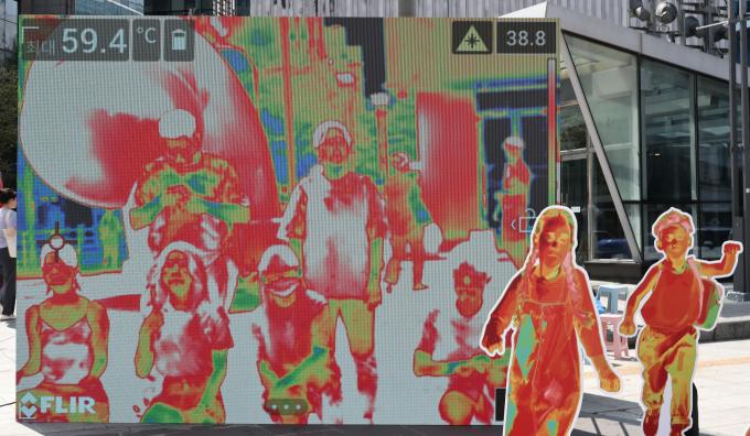 7월이 역사상 가장 뜨거웠던 한 달로 기록되면서 에너지 전환의 필요성을 강조하기 위해 대형스크린을 설치하고 열화상 카메라를 활용해 펼친 퍼포먼스에서 참가자들의 신체 온도가 그대로 스크린에 드러났다.
