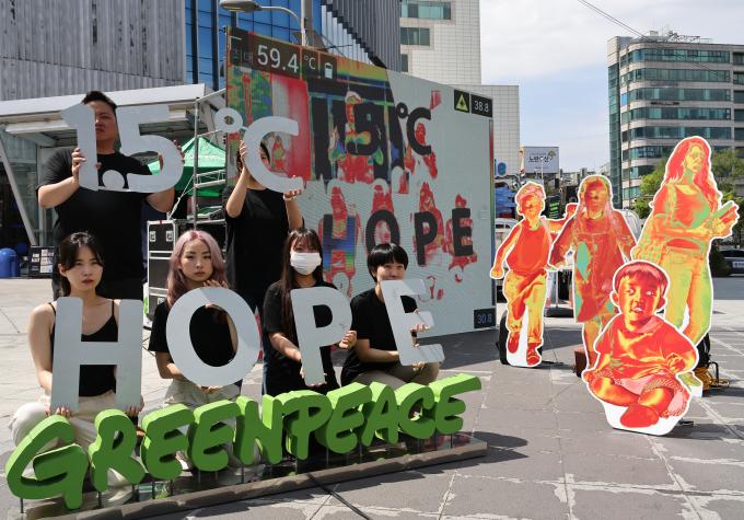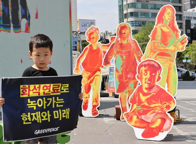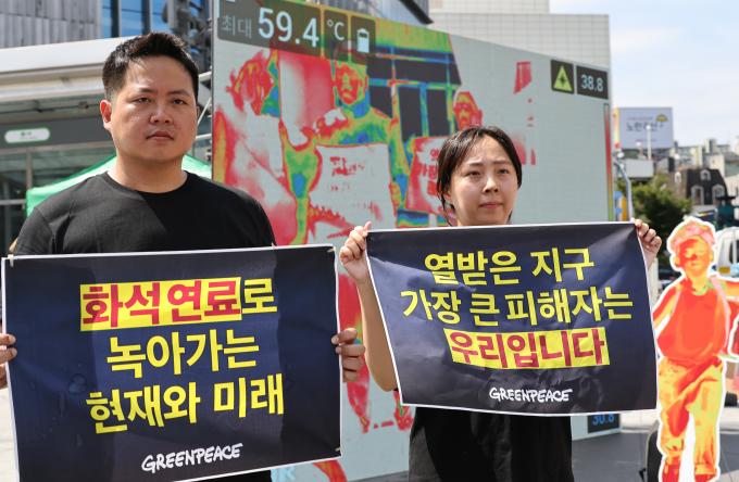 국제환경단체 그린피스가 에너지의 날(22일)을 맞아 21일 오전 서울 신촌 스타광장에서 청년·청소년·액티비스트들과 함께 화석연료 퇴출 및 재생에너지 전환을 촉구하는 열화상 퍼포먼스를 펼쳤다.