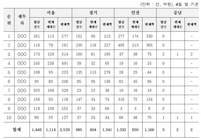 대위변제금 상당액이 상위 10명에 몰려 있다. 숫자로는 전체 집중관리 대상자 중 3%에 불과하지만, 이들을 대신해 HUG가 변제한 금액은 총 5038억원으로 전체의 38%를 차지한다. 이들 10명에게 2370세대가 피해를 입었다.