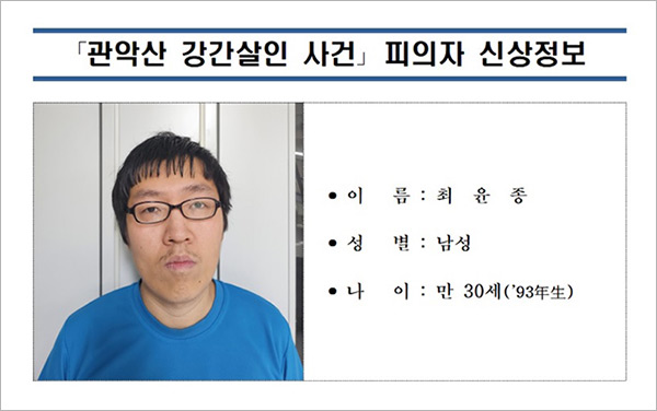 경찰은 최윤종이 사진 촬영과 공개에 동의한 만큼 검거 이후 촬영한 전면 사진 '머그샷'을 공개했다.