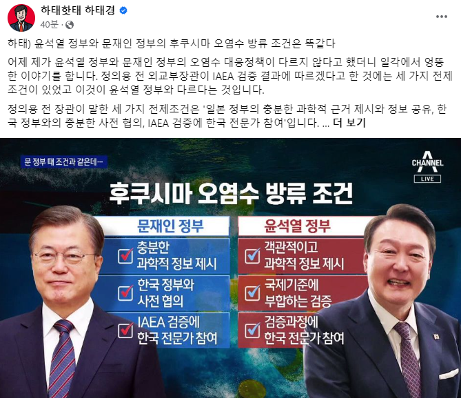 하 의원은 이날 페이스북에 '윤석열 정부와 문재인 정부의 후쿠시마 오염수 방류 조건은 똑같다'는 제목의 글을 올려 문 전 대통령 주장을 조목조목 반박했다. 문 전 대통령은 전날 SNS에 "하태경 의원 때문에 한마디 하지 않을 수 없게 되었다. 나는 일본의 방사능 오염수 방류를 반대한다"고 썼다.