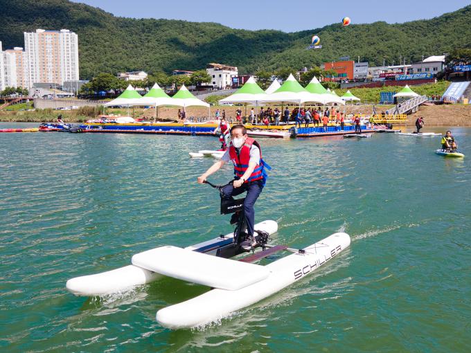 축제 포문을 여는 패러글라이딩과 플라이보드, 모터서프보드 수상 공연에 이어 전국 수영 동호인들이 참가하는 핀수영 대회와 씨카약과 스탠딩보드, 수상자전거 등 무동력기구 체험행사가 열렸다.