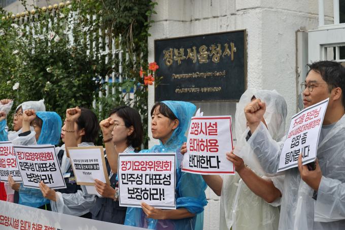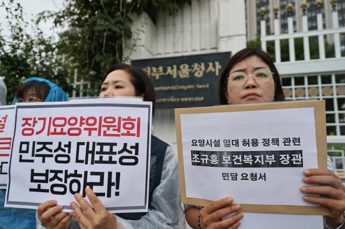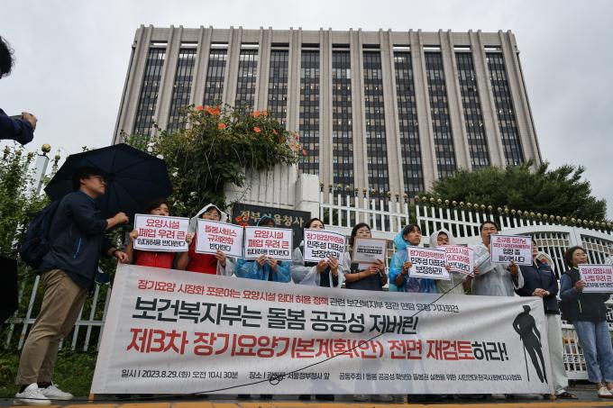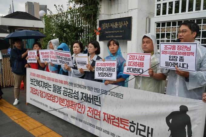 돌봄공공연대와 한국사회복지사협회 등 복지관련 시민단체들이 29일 오전 서울 종로 정부서울청사 앞에서 보건복지부가 지난 17일 발표한 제3차 장기요양기본계획(안) 전면 재검토와 요양시설 임대 허용 정책 추진에 대한 보건복지부 장관 면담을 요청하는 기자회견을 열었다.