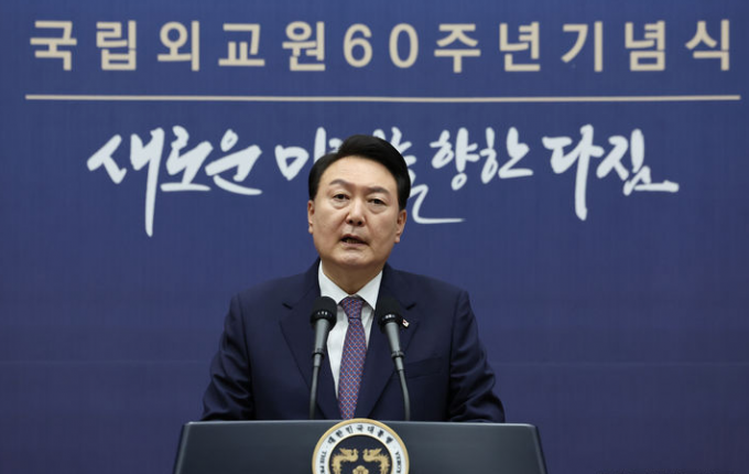 ▲ 윤석열 대통령이 지난 1일 서울 서초구 국립외교원에서 열린 국립외교원 60주년 기념식에 참석해 축사하고 있다. [뉴시스]