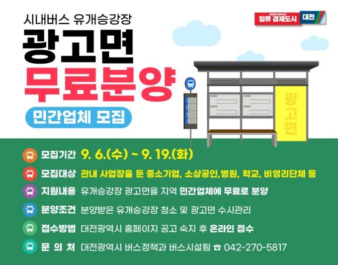 경영난 겪고 있는 중소기업과 소상공인 홍보 지원 위해 대전시가 경영난을 겪고있는 중소기업 및 소상공인 등에 도움을 주기위해 오는 6일부터 19일까지 '2023년도 시내버스 유개승강장 광고면 민간 무료분양'에 참여할 지역업체를 모집한다.