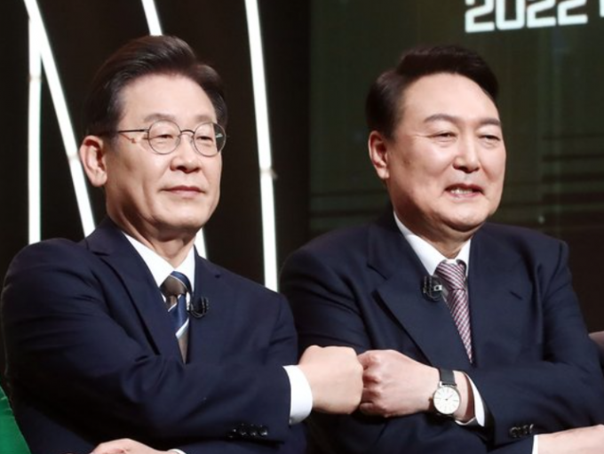 ▲ 지난 2022년 2월 3일 서울 여의도 KBS에서 열린 방송 3사 합동 초청 '2022 대선 후보 토론'에 앞서 당시 국민의힘과 더불어민주당 후보였던 윤석열 대통령과 이재명 대표가 기념촬영을 하고 있다. [뉴시스]