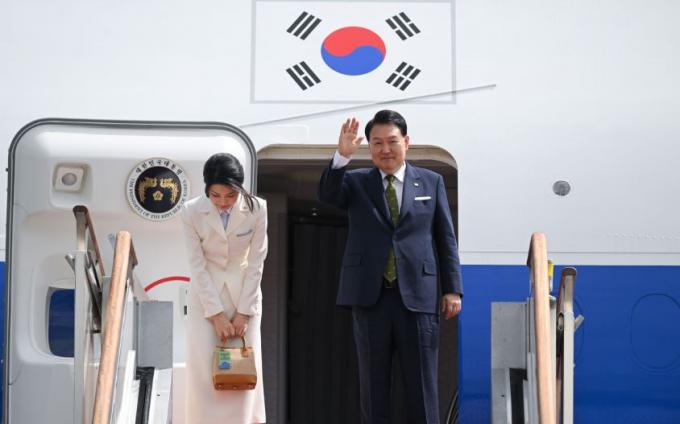 ▲ 윤석열 대통령과 부인 김건희 여사가 5일 경기도 성남 서울공항에서 공군 1호기에 올라 인사하고 있다. [대통령실 제공]