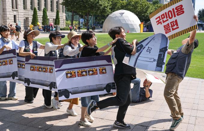 철도민영화저지 하나로운동본부가 6일 오전 서울시청 앞에서 철도 쪼개기 중단과 고속철도 통합을 요구하는 플래시몹을 진행했다.