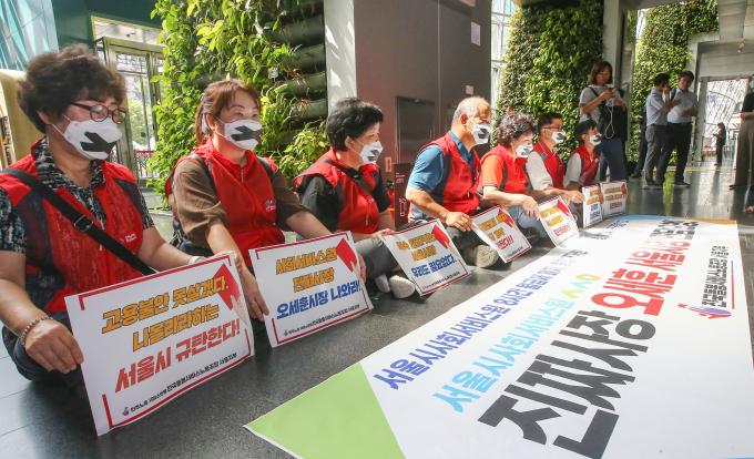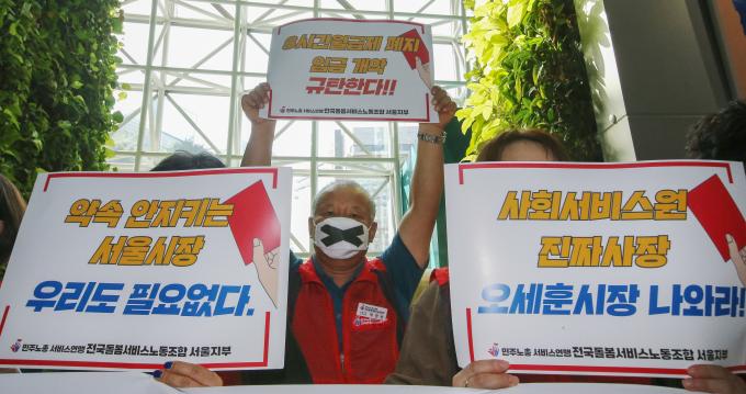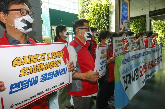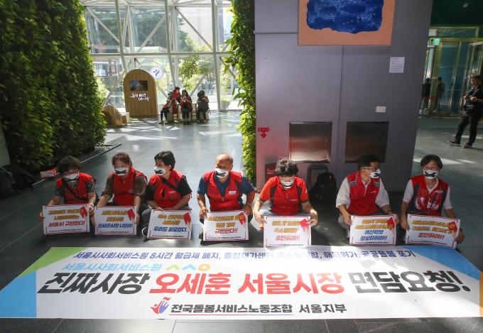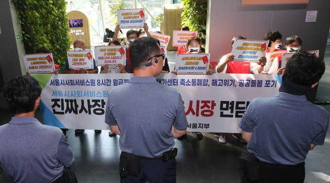 민주노총 서비스연맹 전국돌봄서비스노동조합 서울지부 소속 서울시사회서비스원 요양보호사들이 6일 오세훈 서울시장과의 면담을 요구하며 서울시청 청사 내 로비에서 기습시위를 하였다.