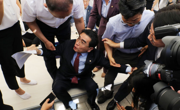 태 의원은 자신에게 전날 국회 대정부질문에서 "쓰레기" 등의 막말을 한 민주당 의원을 출당시키라고 이 대표에게 요구했다. 태 의원 항의 과정에서 민주당 측이 태 의원을 저지했고 고성과 몸싸움이 오갔다. 태 의원은 천막 안에 있던 민주당 의원들의 거센 반발에 3분 만에 농성장에서 끌려 나왔다.