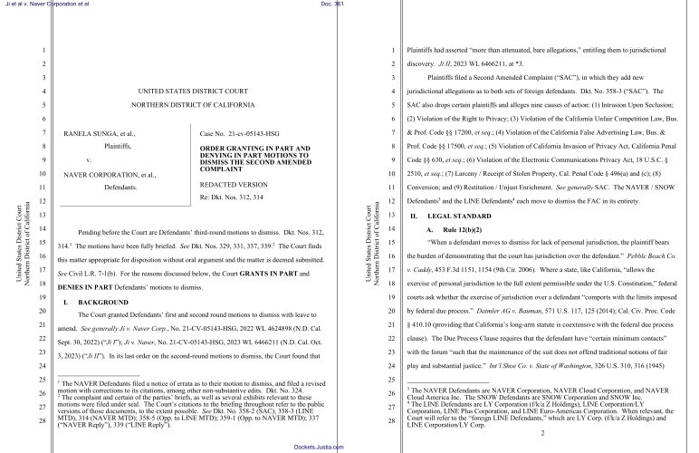 글로벌 법률 전문 매체 로360(Law360)은 24일(현지시간) "미국 캘리포니아 북부 연방법원 헤이우드 길리엄(Haywood S. Gilliam, Jr.) 판사가 네이버 본사와 네이버 클라우드 등 해외 법인을 상대로 제기된 3차 수정 소장에 대해 '관할권 부족'을 이유로 소송 기각(Dismiss)을 결정했다"고 보도했다.