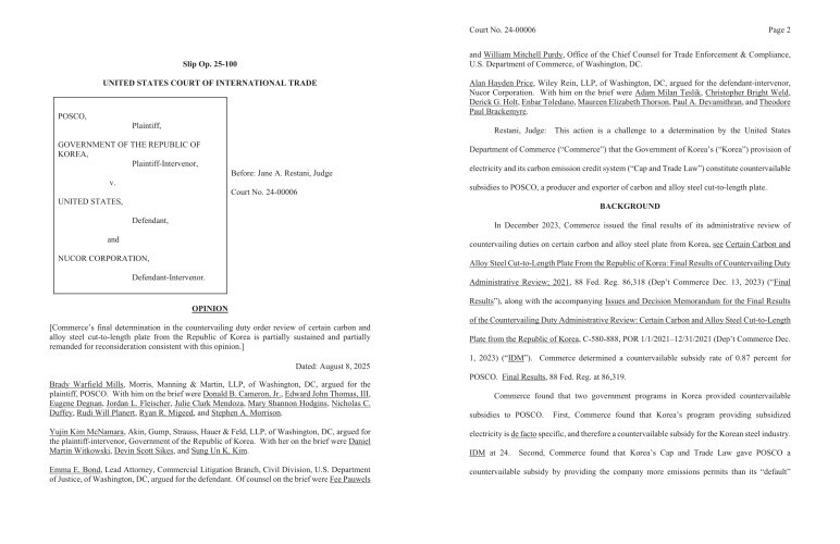 판결문에 따르면, CIT의 제인 레스타니(Jane A. Restani) 판사는 2025년 8월 8일, 상무부의 한국산 탄소·합금강 후판(CTL Plate)에 대한 관세 부과 결정이 부적절하다며 사건을 상무부로 돌려보내는 '환송(Remand) 명령'을 내렸다.