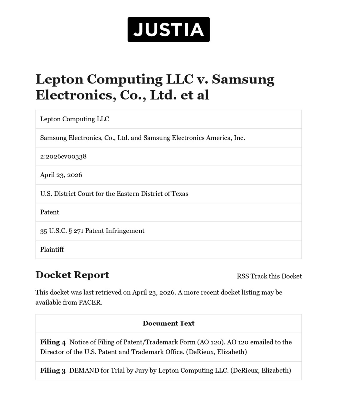 27일 미국 법률 정보 전문 포털인 저스티아(Justia)가 공개한 소송 기록에 따르면, 미국의 기술 기업 '렙톤 컴퓨팅(Lepton Computing LLC)'은 지난 23일(현지시간) 미국 텍사스 동부 연방법원 마샬 부지원에 삼성전자 본사와 삼성전자 미국 법인을 상대로 특허 침해 소송(사건번호 2:26-cv-00338)을 제기했다.