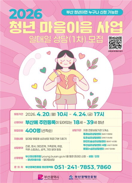 부산시는 정서적으로 어려움을 겪는 청년들의 마음 회복을 돕기 위해 '2026년 청년 마음이음 사업' 참여자를 모집한다고 17일 밝혔다.