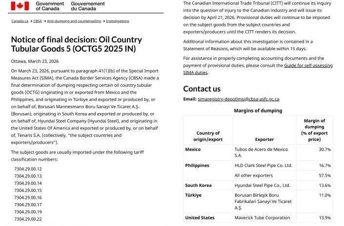 캐나다 국제무역재판소(CITT)는 21일(현지시간) 홈페이지 공고를 통해 "한국·멕시코·필리핀 등에서 수입된 유정용 강관(OCTG)이 캐나다 국내 산업에 실질적인 피해를 주고 있다는 최종 판결을 내렸다"고 밝혔다.