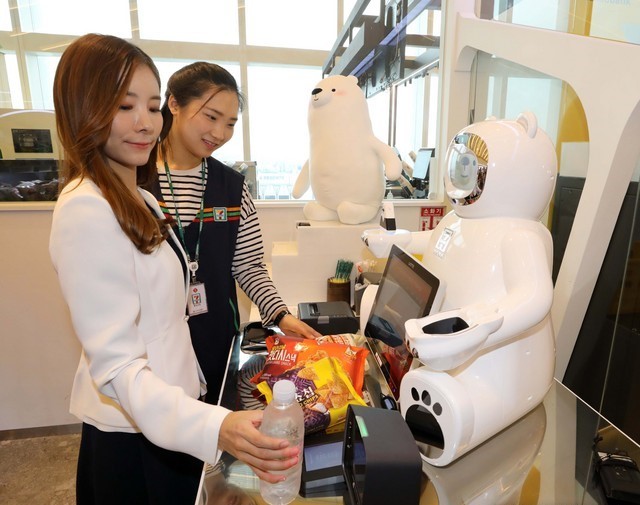 ▲ 지난달 28일 오전 서울 송파구 롯데월드타워 세븐일레븐 시그니처점에서 모델과 직원이 인공지능 결제 로봇 '브니'를 통해 물건 결제를 하고 있다. [뉴시스]