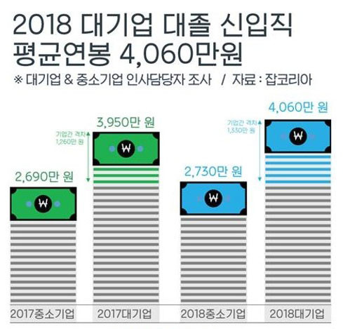 이에 따라 대기업과 중소기업 신입 사원 연봉 차이는 지난해 1260만원에서 올해 1330만원으로 커졌다.