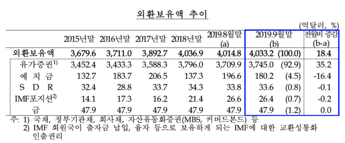 한국은행은 9월 말 기준 우리나라 외환보유액이 전월 말 대비 18억4000만 달러 증가한 4033억2000만 달러로 집계됐다고 4일 밝혔다.