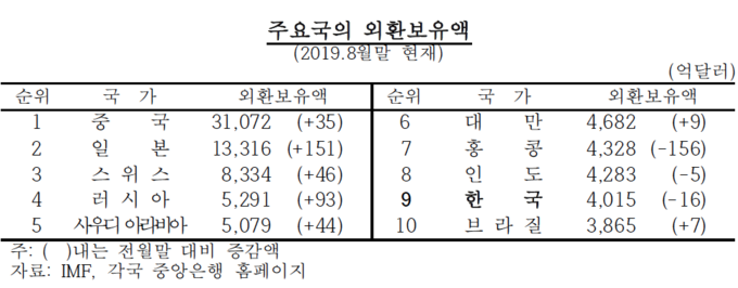 한국의 외환보유액 순위는 8월 말(4015억 달러) 기준 세계 9위를 유지했다. 1위, 2위는 중국(3조1072억  달러)과 일본(1조3316억 달러)이 각각 차지했다.