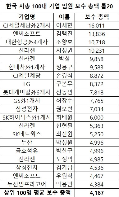 기업평가사이트 CEO스코어는 한·미·일 3국의 시가총액 100대 기업의 지난해 임원 보수 총액을 조사한 결과, 상위 100명의 평균 수령액은 한국이 41억6700만 원, 미국과 일본은 각각 276억7900만 원과 46억7900만 원으로 집계됐다고 24일 밝혔다.