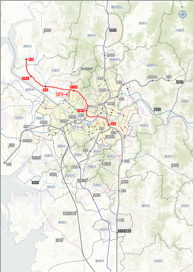 이번에 착공하는 A노선은 파주~일산~삼성~동탄 간 80km 거리로 10개 정거장을 지난다.