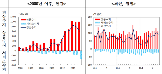 상품수지는 110억달러 흑자를 냈다. 석유제품, 기계류 호조 속에 수출이 572억4000만달러로 역대 최대를 기록했다. 전년 동기보다 28.8%나 증가한 수치다. 작년 10월 장기 추석 연휴 때문에 영업일 수가 줄었다가 늘어난 영향도 작용했다.