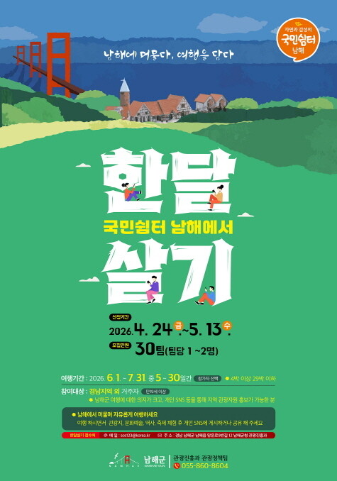 상반기 참가자 신청은 5월 13일까지다. 선정된 팀은 6월부터 7월까지 남해군을 자유롭게 여행할 수 있다. 사후에 홍보내역이 확인되면 숙박비(팀당 1박 7만 원)와 체험비(인당 최대 10만 원), 그리고 보험료(인당 2만 원)를 지원한다.