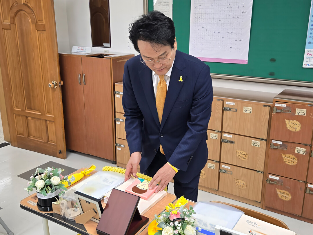 ▲ 안민석 경기도교육감 예비후보가 16일 안산 단원고 4·16기억교실에서 희생자들을 추모하고 있다. [안민석 예비후보 캠프 제공]