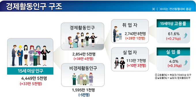 실업률은 4.0%로 전년 동기보다 0.3%포인트 올랐다. 15∼29세 청년층 실업률은 10.4%였다. 체감 실업률을 보여주는 고용보조지표3은 0.5%포인트 올라 11.9%였다.