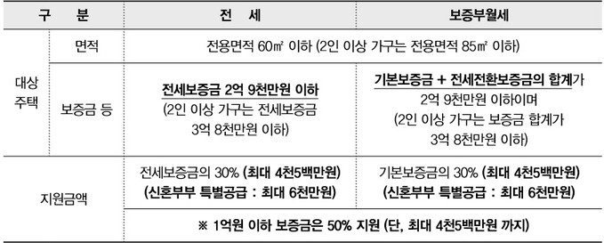 지원 대상 주택은 순수 전세주택과 보증부월세주택(반전세)으로, 보증금 한도는 1인 가구의 경우 순수 전세의 전세금 또는 보증부월세의 기본보증금과 전세전환보증금의 합이 2억9000만원 이하, 2인 이상 가구의 경우 최대 3억8000만원 이하의 주택이다.