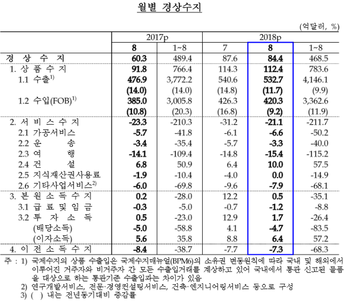 경상수지 흑자는 글로벌 교역 호조세와 반도체 시장 호황의 영향이 크다. 수출은 532억 7000만달러로 지난해 같은달보다 11.7% 늘어났다. 국제유가가 오른 탓에 수입도 420억3000만달러로 전년동월대비 9.2% 늘었으나 수출 증가폭보다는 적었다. 이에 상품수지는 112억 4000만달러 흑자를 기록했다.