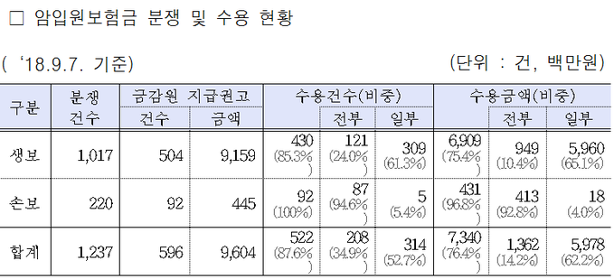 금융감독원의 암보험 지급권고에 대한 보험사의 수용률이 87.6%, 금액 기준으로는 76.4%인 것으로 나타났다.