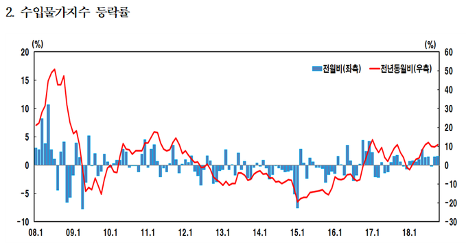 지난해 같은 달과 견줘 보면 수출물가는 1.3%, 수입물가는 10.7% 각각 상승했다.