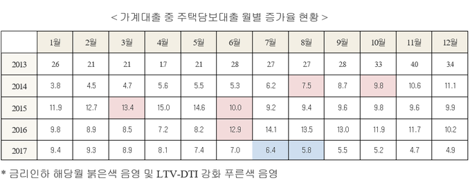 주택담보대출 증가율 역시 2013년 3.4%에서 2014년 11.1%까지 급증했고 2015년 9.9%, 2016년 10.2%까지 매년 증가하다 2017년 LTV-DTI 강화 후 감소됐다.
