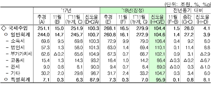 세수 진도율은 추가경정예산안 편성 당시 전망한 국세수입을 상회하는 104.4%로 나타났다. 세수 집행실적은 11월에 집행할 계획이었던 257조9000억원을 2조7000억원 초과한 260조6000억원으로, 연간계획의 92%를 쓴 것으로 집계됐다.
