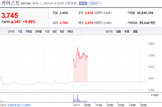 15일 오전 10시 20분 현재 키이스트는 전날보다 340원 오른 3745원에 거래되고 있다. 키이스트는 일본 자회사인 디지털 어드벤처(DA)가 방탄소년단과 일본 매니지먼트 전속계약을 맺어 대표적인 방탄소년단 관련주로 분류된다.
