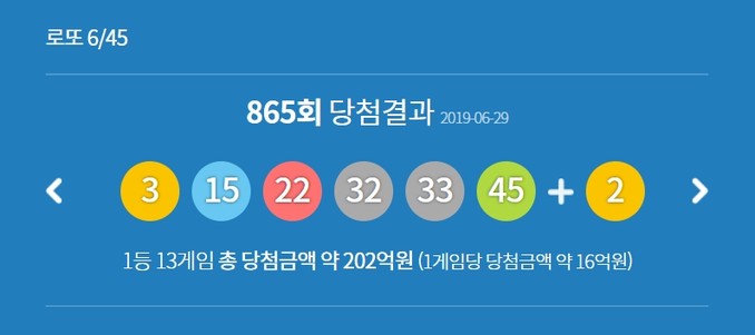 29일 로또 수탁업체 동행복권은 복권통합포털을 통해 제865회 로또복권 당첨번호를 공개했다. 이날 발표된 1등 당첨번호는 3, 15, 22, 32, 33, 45며 2등 보너스번호는 2다.