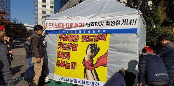 한편 카드사 노동조합으로 구성된 금융공동투쟁본부 카드분과는 수수료 인하가 부당하다며 12일부터 서울 영등포구 여의도 중앙당사 앞에서 천막 농성을 벌이는 중이다.