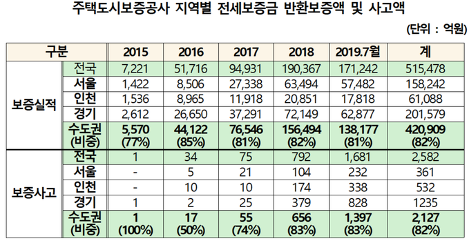 지역별로는 보증 사고액 2582억 원 중 82%(2127억 원)가 수도권에서 발생했다.
