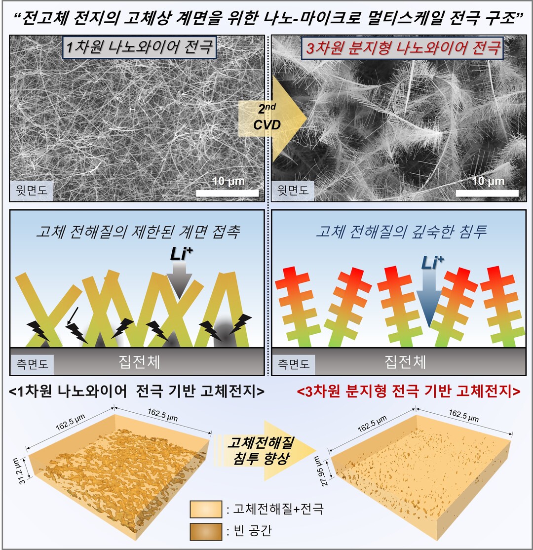 포스텍·국립부경대 연구팀이 전고체 전지의 성능 한계를 극복하기 위한 3차원 분지형 나노 전극 구조를 개발했다.