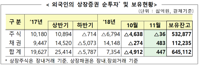 주식과 채권을 합친 외국인 상장증권 보유액은 645조1120억원으로 10월 대비 4470억원 증가했다. 주식이 532조8770억원, 채권이 112조2350억원어치다.