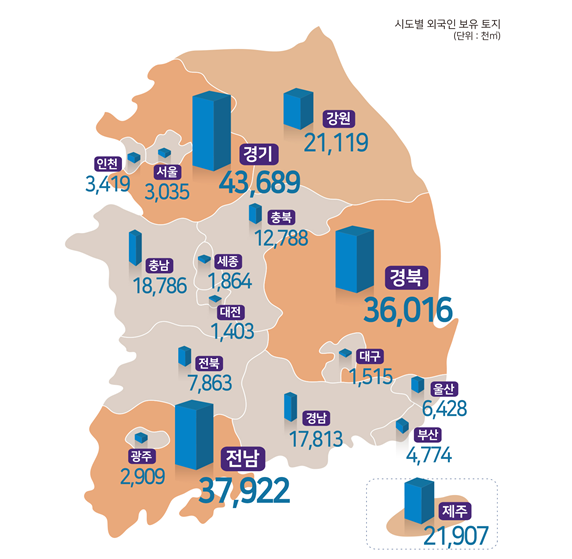 외국인이 가장 많이 토지를 보유하고 있는 지역은 경기도로 지난해 대비 2.3% 증가한 4369만㎡를 기록했다. 외국인 보유 토지의 18.0%다. 이어 전남 3792만㎡(15.6%), 경북 3602만㎡(14.8%), 제주 2191만㎡(9.0%), 강원 2112만㎡(8.7%) 순이다. 용도별로는 임야·농지 등이 1억5822만㎡(65.0%)로 가장 많고, 공장용 5867만㎡(24.1%), 레저용 1220만㎡(5.0%), 주거용 1020만㎡(4.2%), 상업용 395만㎡(1.6%) 이 뒤를 따랐다.