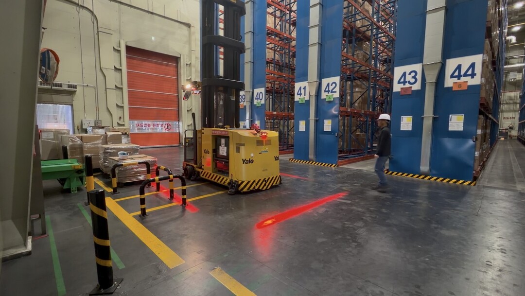| ▲ BAT 사천공장에서 스마트 안전시스템 기술이 적용된 지게차가 바닥에 위험 구역을 표시하고 있다. [BAT로스만스 제공] |
