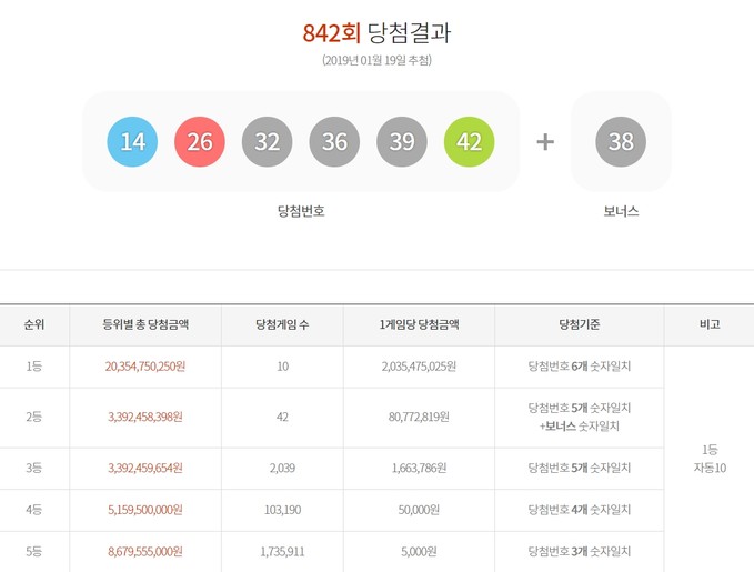지난 19일 로또복권 운영사 동행복권은 제842회 로또 당첨번호를 공개했다. 이날 공개된 번호는 14, 26, 32, 36, 39, 42며 보너스 번호는 38이다.